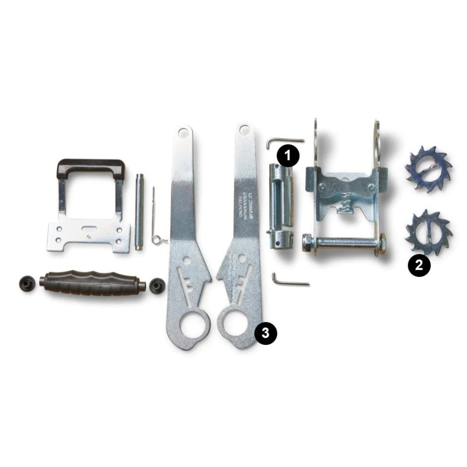 Vi indarbejdede en enkel idé i den eksisterende surringsskralde. Vi smedede en ny specialdesignet, højlegeret og hærdet, halvåben skraldeaksel (1), forstærkede tandhjulene (2) og spændehåndtaget (3)